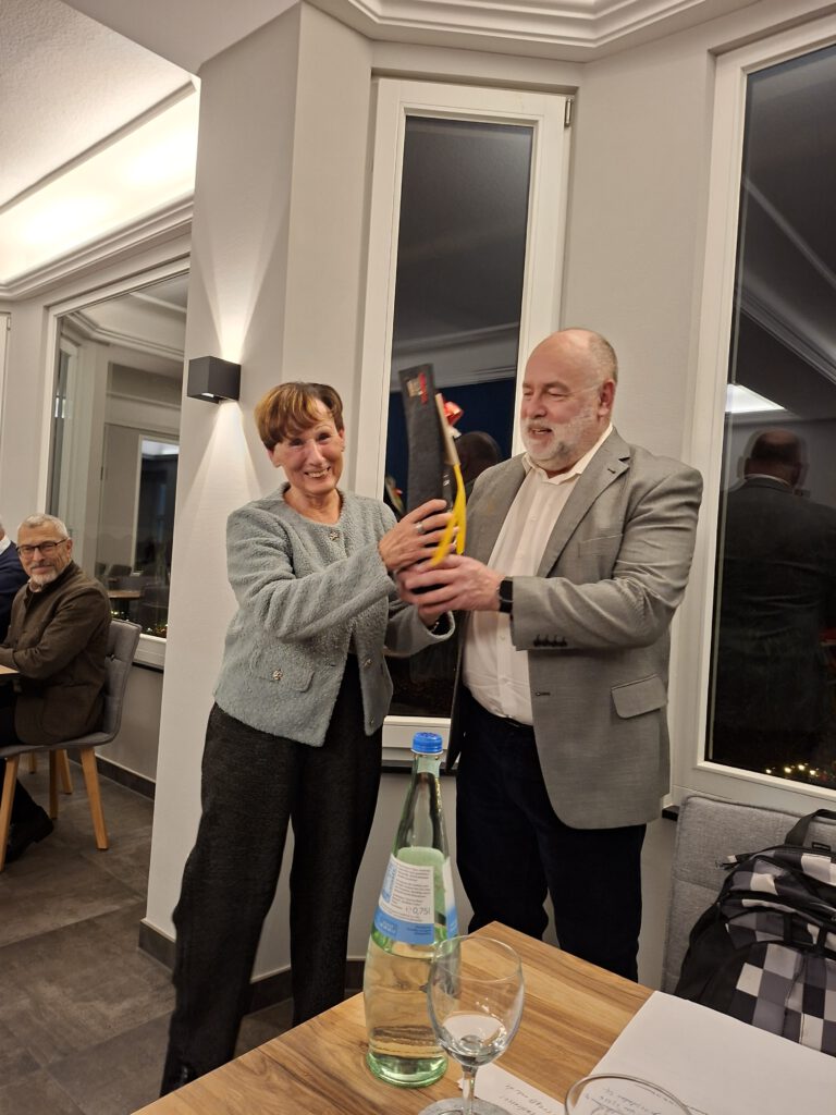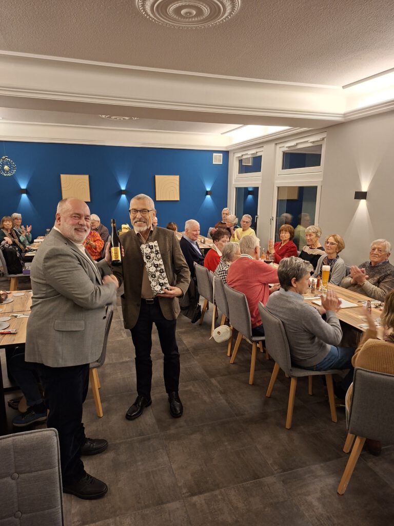 Auch in diesem Jahr führte die Interessengruppe Wandern der Kameradschaft Ehemalige, Reservisten und Hinterbliebene (KERH) Kreis Ahrweiler im Deutschen Bundeswehrverband eine eigene Jahresabschlussfeier durch. Hierzu hatte der Leiter der Interessengruppe, Stabsfeldwebel (StFw) a.D. Holger Wahl, am 04. Dezember 2025 in Ringshausers Restaurant & Weinbar eingeladen. Zahlreiche Wanderfreunde waren seiner Einladung gefolgt und so konnte H. Wahl wesentlich mehr Teilnehmende als bei den diesjährigen Wanderungen begrüßen. Da die Mitglieder der Wandergruppe immer älter werden, würde sich dieser positive Umstand aber auch auf die Wanderstrecke und die Teilnahme beim Wandern auswirken. Der gemütliche Abschluss jeder Wanderung würde weitaus mehr Teilnehmer anlocken als die Wanderung selbst, hier hoffe er, dass sich in Zukunft auch wieder mehr Jüngere fürs Wandern interessieren und dann teilnehmen würden. Im Anschluss an die Begrüßung übermittelte der stellvertretende Vorsitzende der KERH, Oberst (O) a.D. Franz Maurer viele Grüße des Vorsitzenden, Fregattenkapitän a.D. Ulf Neelsen, der aus persönlichen Gründen nicht teilnehmen konnte, und dankte den Wanderfreunden für Ihre Unterstützung und Teilnahme an den Wanderungen. Mit einem Weinpräsent dankte er dem Leiter der Interessengruppe Wandern, StFw a.D. Holger Wahl, für sein Engagement und die Organisation der Interessengruppe. Nachdem Michael Ringshauser den Anwesenden ein hervorragendes Essen serviert hatte, dankte Wahl der Wanderkönigin und dem Wanderkönig, Frau Annemie Klasen und Herrn Günter Frömbgen, die beide aus persönlichen Gründen an diesem Abend nicht anwesend sein konnten, und versprach, das traditionelle Präsent für den/die Wanderkönig*In zu einem späteren Zeitpunkt zu überreichen. Er hoffe, dass das jährlich zu überreichende Präsent als Motivation dazu diene, die Teilnahme an den Wanderungen im nächsten Jahr zu erhöhen. Aber auch den anwesenden Wanderführern dankte er mit einem Präsent, ohne Ihre Bereitschaft würden viele Wanderungen erst gar nicht starten, so Wahl weiter. Bevor die ersten Gäste den Heimweg antraten, überraschte Christine Reiß im Namen der Wanderer Holger Wahl mit einem Weinpräsent und dankte ihm für sein Bemühen, die Wandergruppe „am wandern“ zu halten.